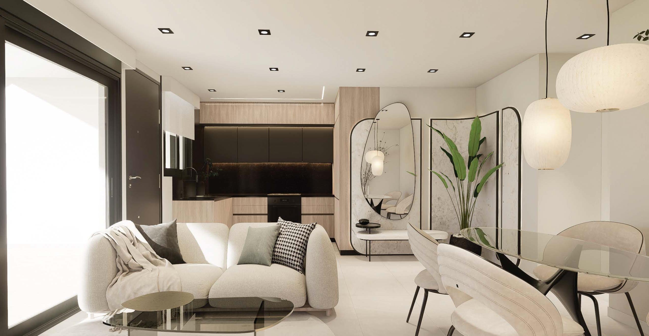 The exteriors of these bungalows are designed to maximize enjoyment of the Mediterranean climate. Each property features a private garden, perfect for creating a personal green space or enjoying outdoor moments. Additionally, the terraces offer an ideal place to relax or share with friends and family. For those seeking panoramic views, the high-bungalows include a solarium, providing additional space for leisure and relaxation. The proximity to the sea adds special value, allowing enjoyment of the sea breeze and beach walks just one kilometer away.