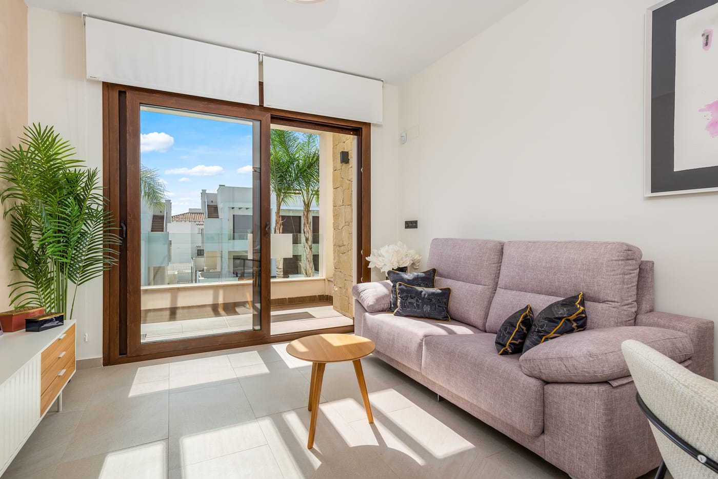 The outdoor spaces of these properties are designed to maximize enjoyment of the Mediterranean climate. Each home features a private terrace, ideal for relaxing outdoors. Additionally, the bungalows have a solarium, perfect for sunbathing in the privacy of your home. The presence of a pergola adds a touch of elegance and functionality, providing shade and style. The common areas include well-maintained gardens, offering a green and tranquil environment for walking or resting.