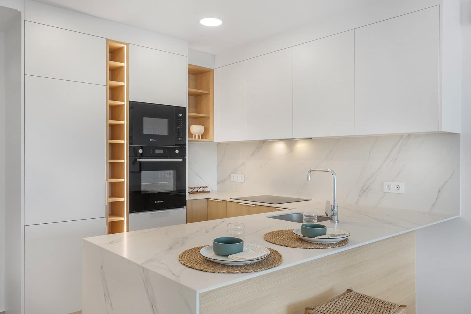 Inside, the homes are equipped with modern features that ensure comfort and style. The apartments and penthouses offer options of 2 or 3 bedrooms and 2 or 3 bathrooms, catering to different family needs. Porcelain tile floors add a touch of elegance and are easy to maintain. The kitchens are equipped with appliances, making daily life easier. Built-in wardrobes provide efficient storage, while the pre-installation of air conditioning ensures a pleasant environment year-round. Additionally, there is the option to purchase a garage, adding convenience and security.