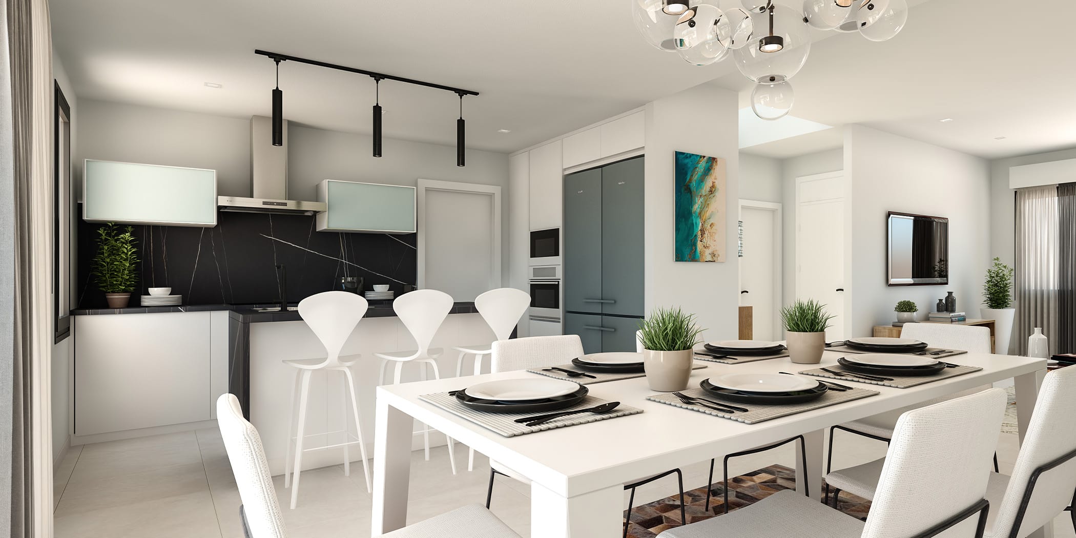 The exterior design of these homes in Dénia stands out for its integration with the natural environment. Each property has a private garden, ideal for enjoying the Mediterranean climate. Additionally, terraces and solariums offer additional outdoor spaces, allowing residents to enjoy unobstructed views and moments of relaxation. The presence of a private pool in each home adds a touch of exclusivity, turning the home into a personal oasis. The communal landscaped areas complement the environment, providing a shared green space for all residents to enjoy.