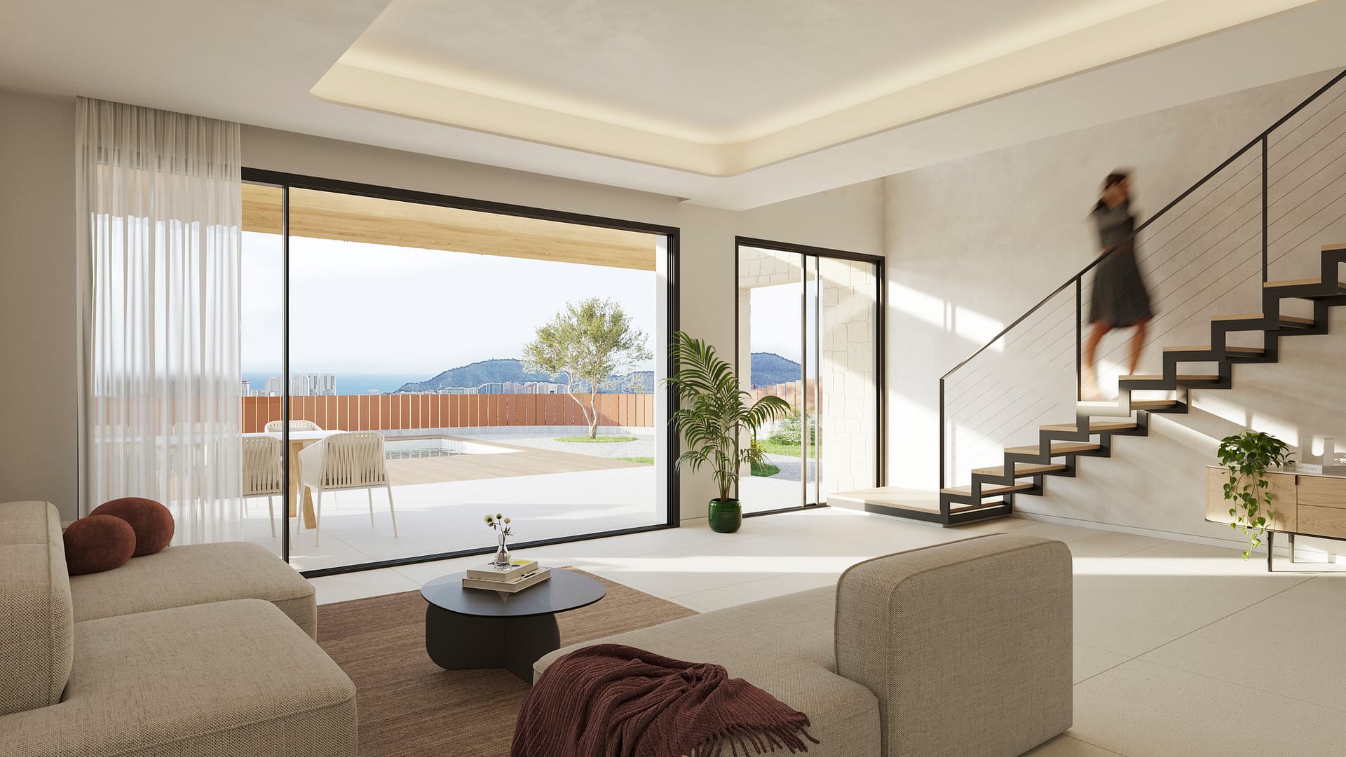 The exterior design of the villas in Finestrat is intended to maximize enjoyment of the natural surroundings. Each villa features a private garden, perfect for enjoying the outdoors and the Mediterranean climate. The spacious terraces offer an ideal space to relax and take in the stunning sea views. Additionally, the villas are equipped with pergolas that provide shade and an additional aesthetic touch to the outdoor space. The presence of a garage ensures convenience and security for residents’ vehicles.