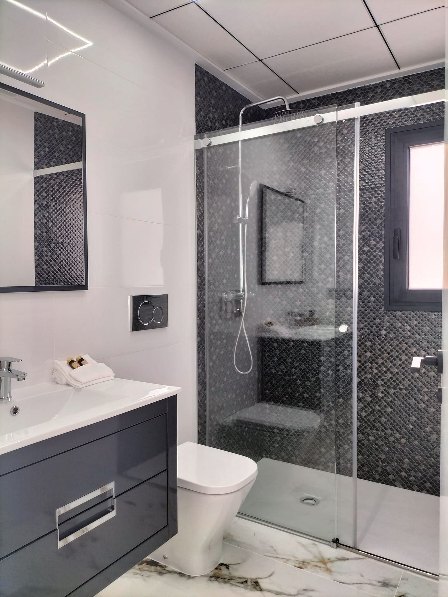 The interiors of these detached homes are designed to offer maximum comfort and functionality. Each property features three bedrooms and two bathrooms, providing a spacious and comfortable area for the whole family. Porcelain tile floors add a touch of elegance and are easy to maintain. The homes are equipped with underfloor heating, ensuring a warm environment during the colder months. Electric shutters and built-in wardrobes are standard features that add convenience and practicality to daily life. Additionally, each home includes a garage, offering a secure space for parking.