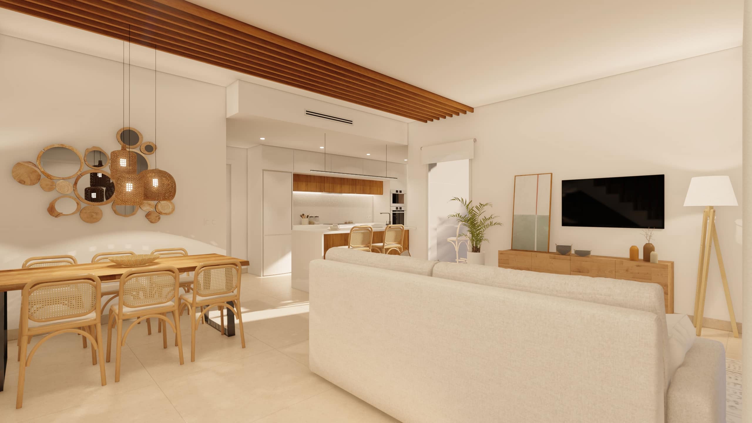 The interiors of these homes have been designed with comfort and functionality in mind. Featuring a layout that includes three bedrooms and three bathrooms, each villa offers a spacious and well-organized space. The ceramic flooring adds a modern touch and is easy to maintain. The homes are fully furnished, making moving in easy and allowing residents to enjoy the space from day one. The kitchen is equipped with appliances, ensuring residents have everything they need for daily living. Additionally, they come with air conditioning and electric blinds, ensuring comfort and energy efficiency. Built-in wardrobes offer practical and elegant storage solutions, while the pre-installation of air conditioning allows for future upgrades according to residents’ needs.