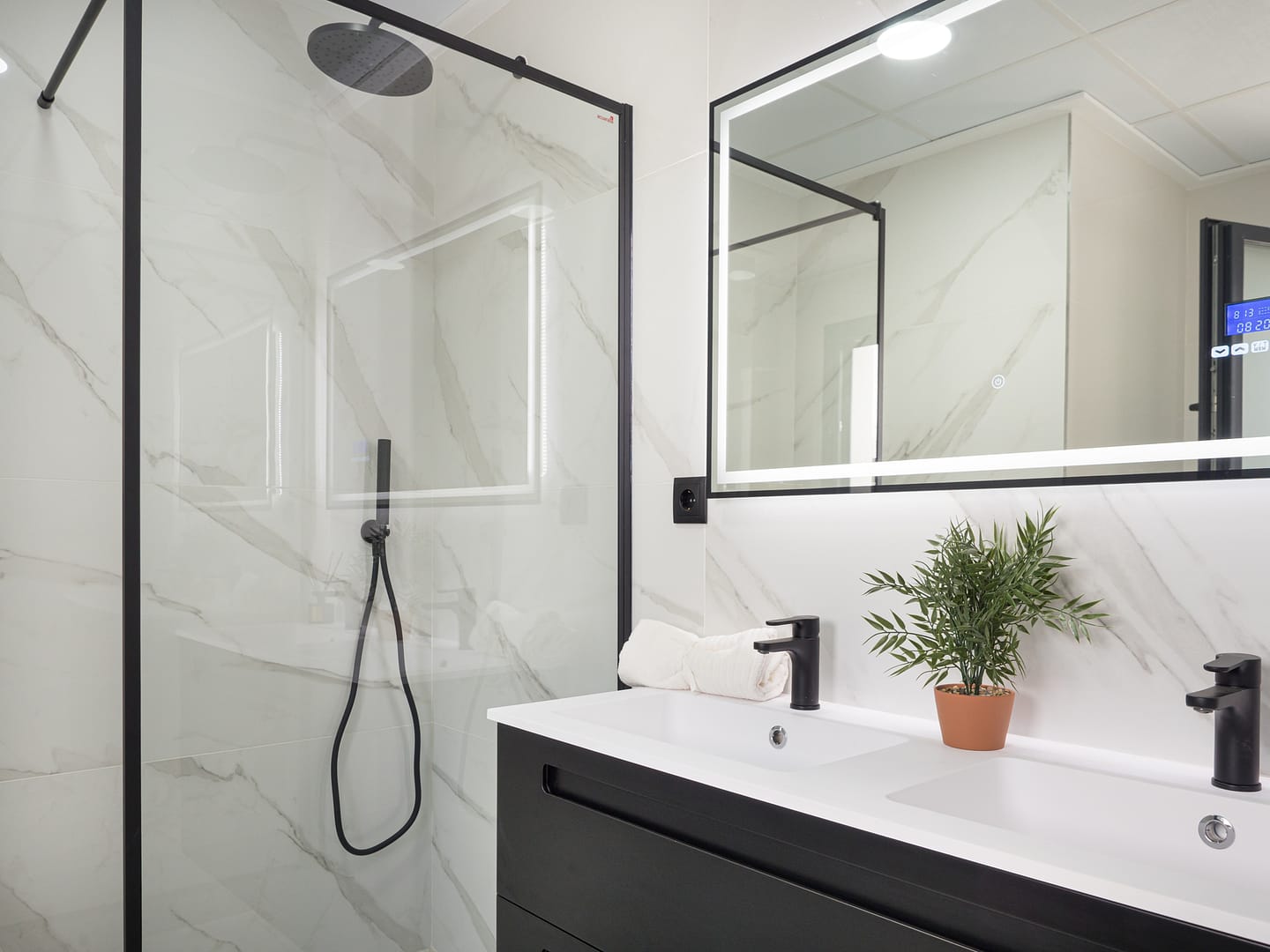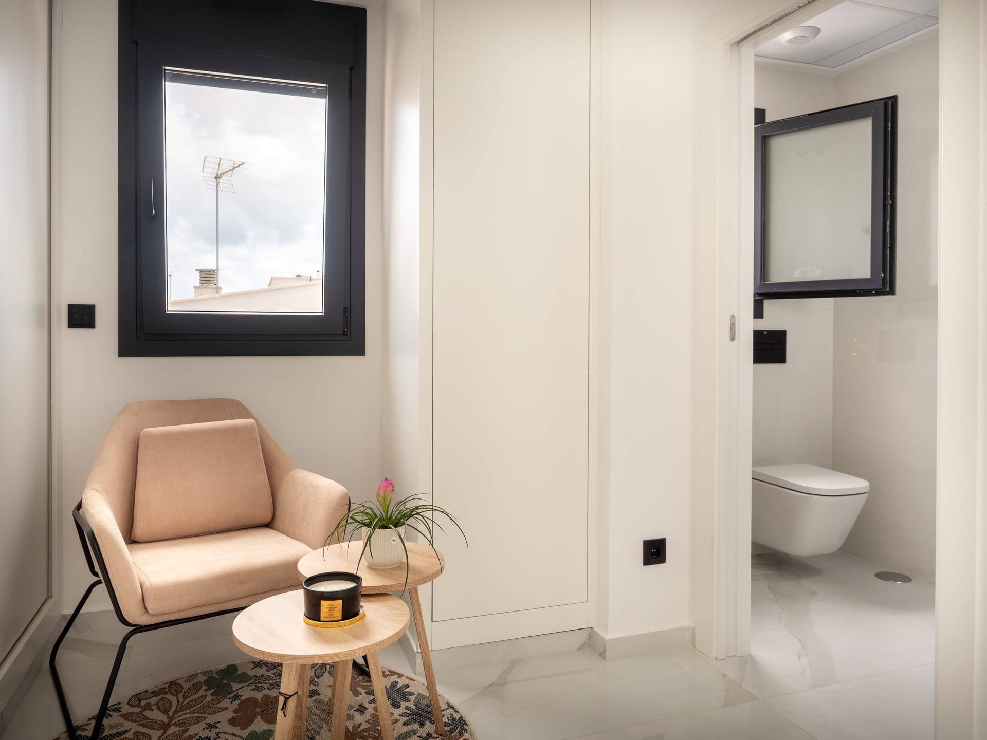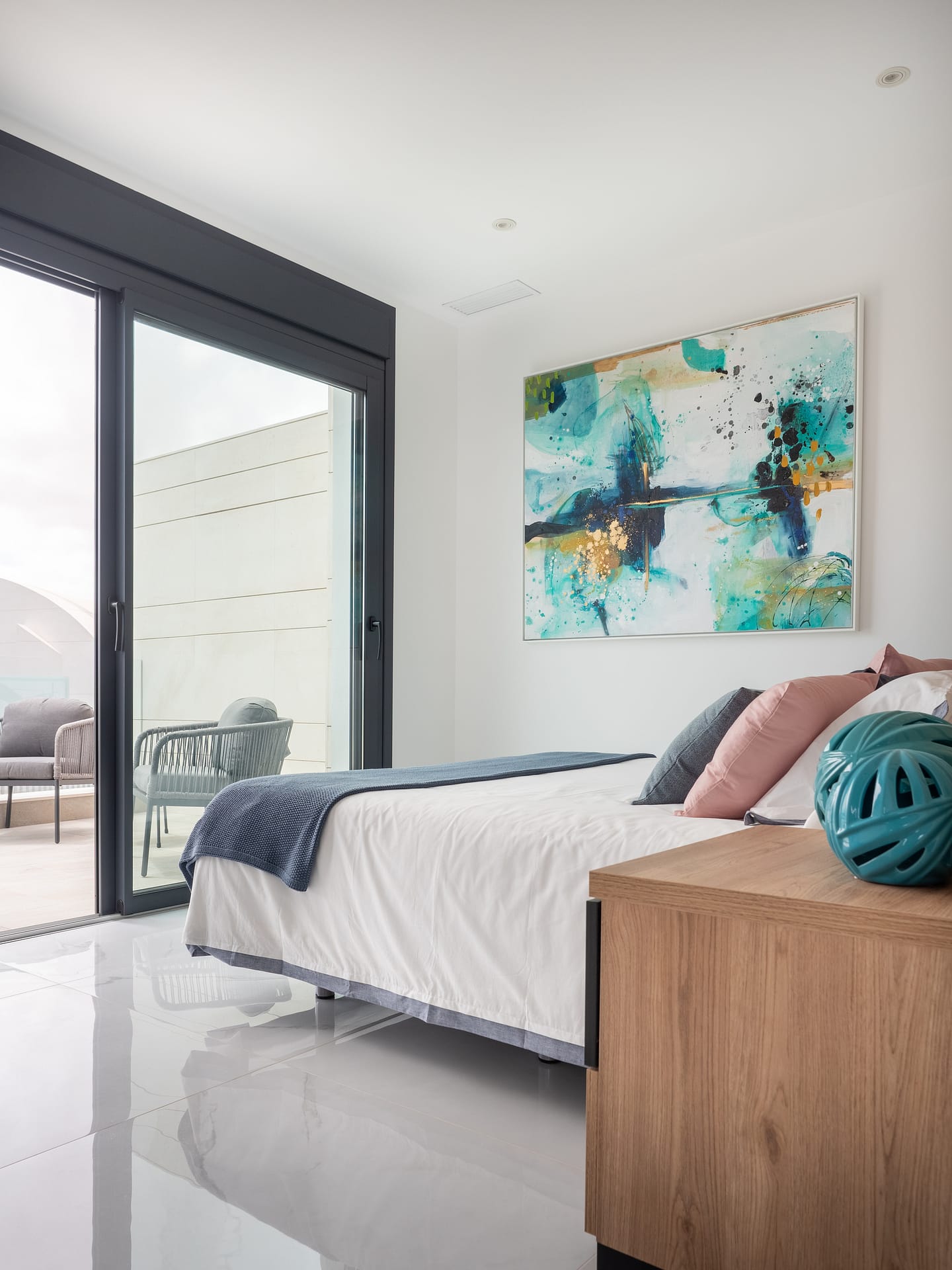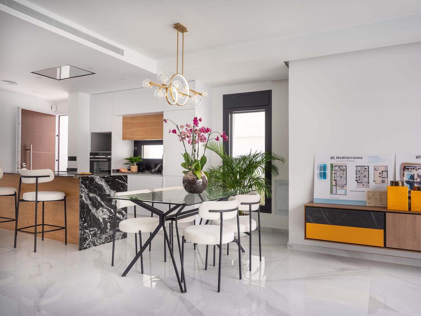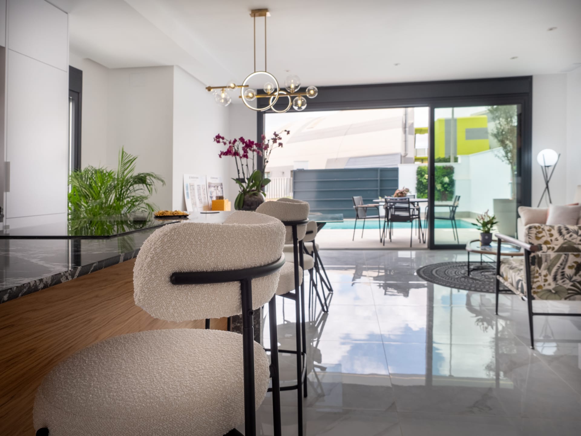 The exteriors of these homes are designed to enjoy the Mediterranean climate. Each property features a private garden, perfect for creating a personal green space. Additionally, they have a private pool, ideal for cooling off during warm summer days. The terraces and solariums offer additional outdoor spaces, perfect for relaxing or enjoying outdoor gatherings with open views.