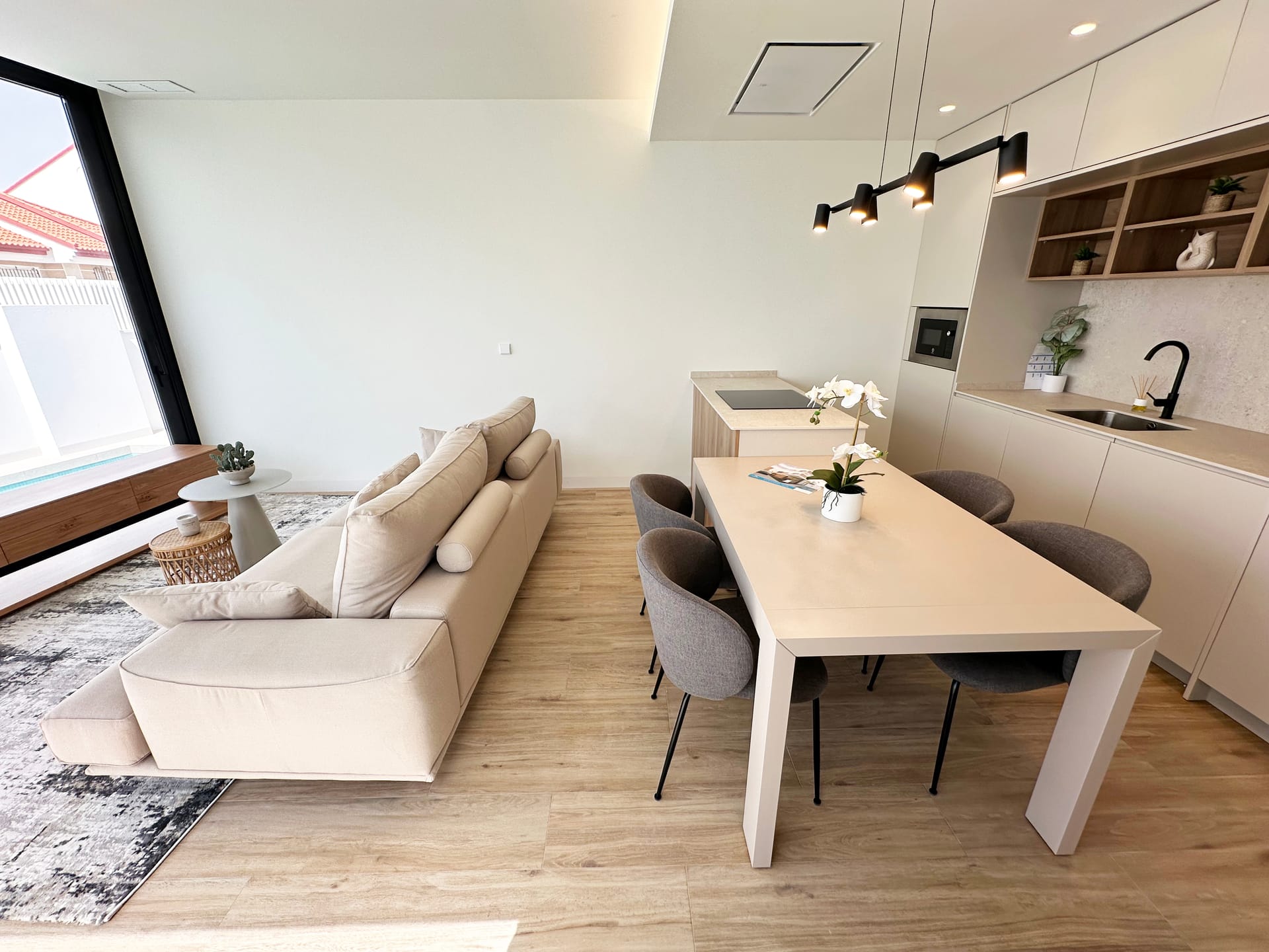 The interiors of these detached homes in Torre de la Horadada are designed to offer maximum comfort and functionality. Ceramic floors provide a modern touch and are easy to maintain, while the air conditioning system ensures a pleasant environment year-round. The homes are equipped with high-quality appliances, facilitating daily tasks and enhancing the living experience. Built-in wardrobes provide ample storage space, maintaining order and organization in the home. Additionally, electric shutters and the video intercom add an extra level of convenience and security, allowing efficient control of access to the home.