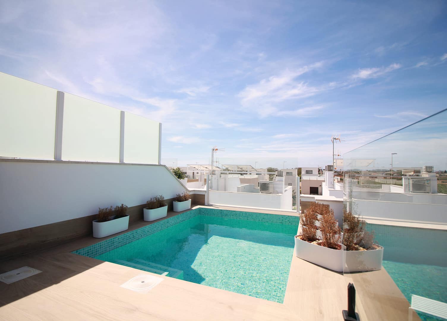 The outdoor spaces of these homes are designed to offer relaxation and enjoyment in the open air. Each property features a private garden, ideal for enjoying the Mediterranean climate. The terrace is perfect for outdoor dining or simply relaxing with a good book. Additionally, residents can enjoy a solarium, an additional space offering unobstructed views and the opportunity to sunbathe in total privacy. For those looking to cool off during hot summer days, each bungalow has a private pool, providing a personal oasis of tranquility.