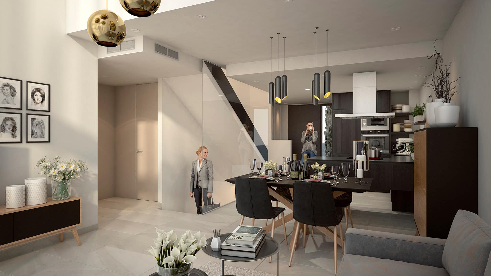 Inside, the townhouses are designed to offer maximum comfort and functionality. Each property has three bedrooms and two bathrooms, providing a spacious and well-distributed space for the whole family. The built-in wardrobes in the bedrooms offer practical and elegant storage solutions. The layout also includes a private garage, ensuring convenience and security for the residents. The interior design focuses on quality and efficiency, creating a welcoming and modern atmosphere.