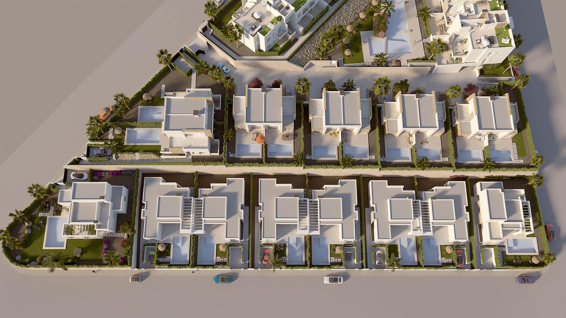 Inside, the townhouses are designed to offer maximum comfort and functionality. Each property has three bedrooms and two bathrooms, providing a spacious and well-distributed space for the whole family. The built-in wardrobes in the bedrooms offer practical and elegant storage solutions. The layout also includes a private garage, ensuring convenience and security for the residents. The interior design focuses on quality and efficiency, creating a welcoming and modern atmosphere.