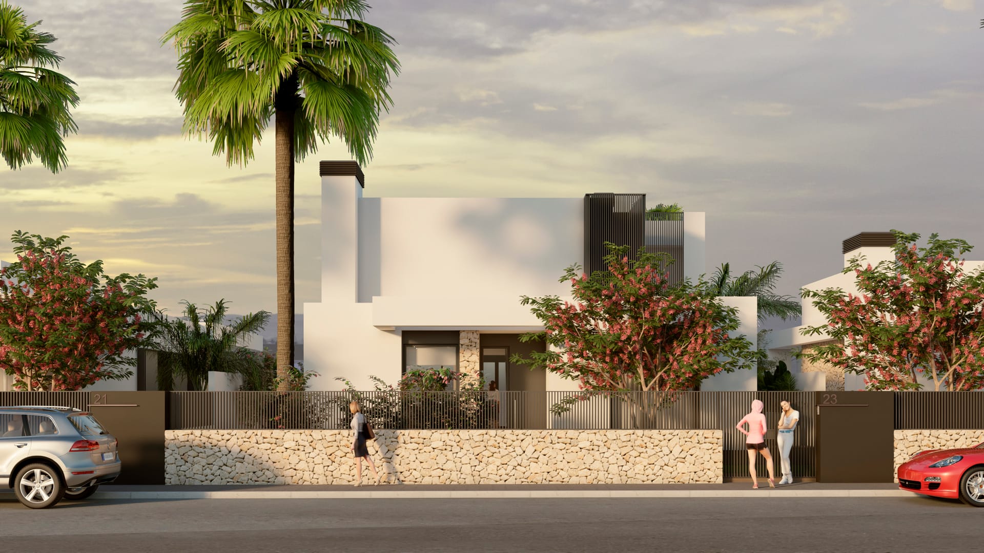 The exterior design of these villas in Algorfa stands out for its elegance and functionality. Each property includes a private garden, perfect for enjoying the Mediterranean climate and hosting outdoor gatherings. Additionally, the villas feature a terrace that offers additional space for leisure and relaxation. The presence of a solarium allows for panoramic views and moments of relaxation under the sun. For added convenience, each villa comes with a private garage, ensuring easy and secure access to the home. The proximity to the golf course, just 100 meters away, adds significant value to the location, offering a green and well-maintained environment.