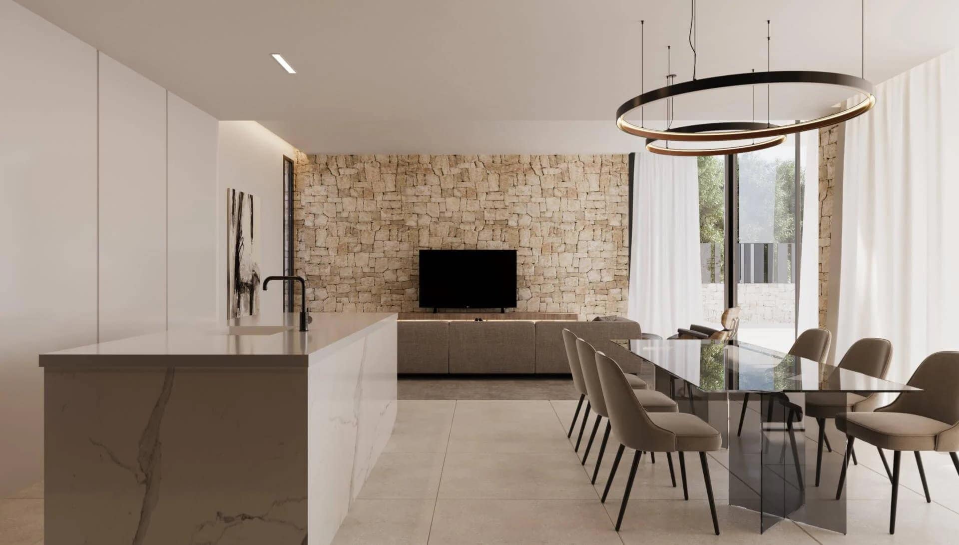 The interior of the villa is carefully arranged to offer comfort and functionality. With three bedrooms, this property is perfect for families or those needing extra space for guests. Each bedroom is equipped with built-in wardrobes, providing ample storage space. The villa has three bathrooms, ensuring comfort and privacy for all occupants. Additionally, the property includes a garage, offering a secure parking space for vehicles.