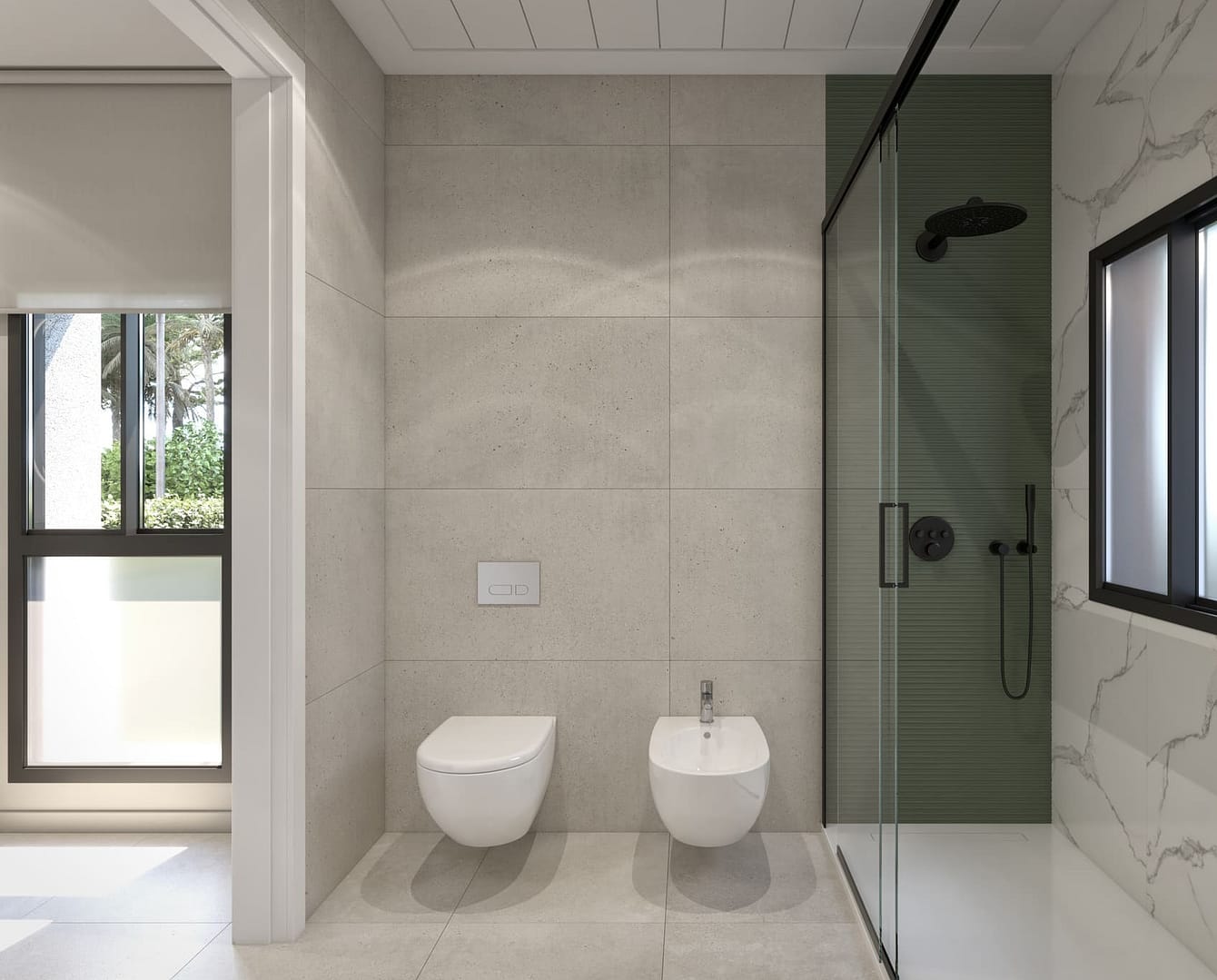 The interior of these villas has been designed to offer maximum comfort and functionality. With three bedrooms and two bathrooms, each space is optimized to meet the needs of a modern family. Porcelain tile floors add a touch of elegance and are easy to maintain. The villas are equipped with high-quality appliances, ensuring the kitchen is both practical and stylish. Electric shutters and built-in wardrobes are standard features that add convenience and efficiency to daily life. Every detail has been carefully considered to create a welcoming and contemporary home.