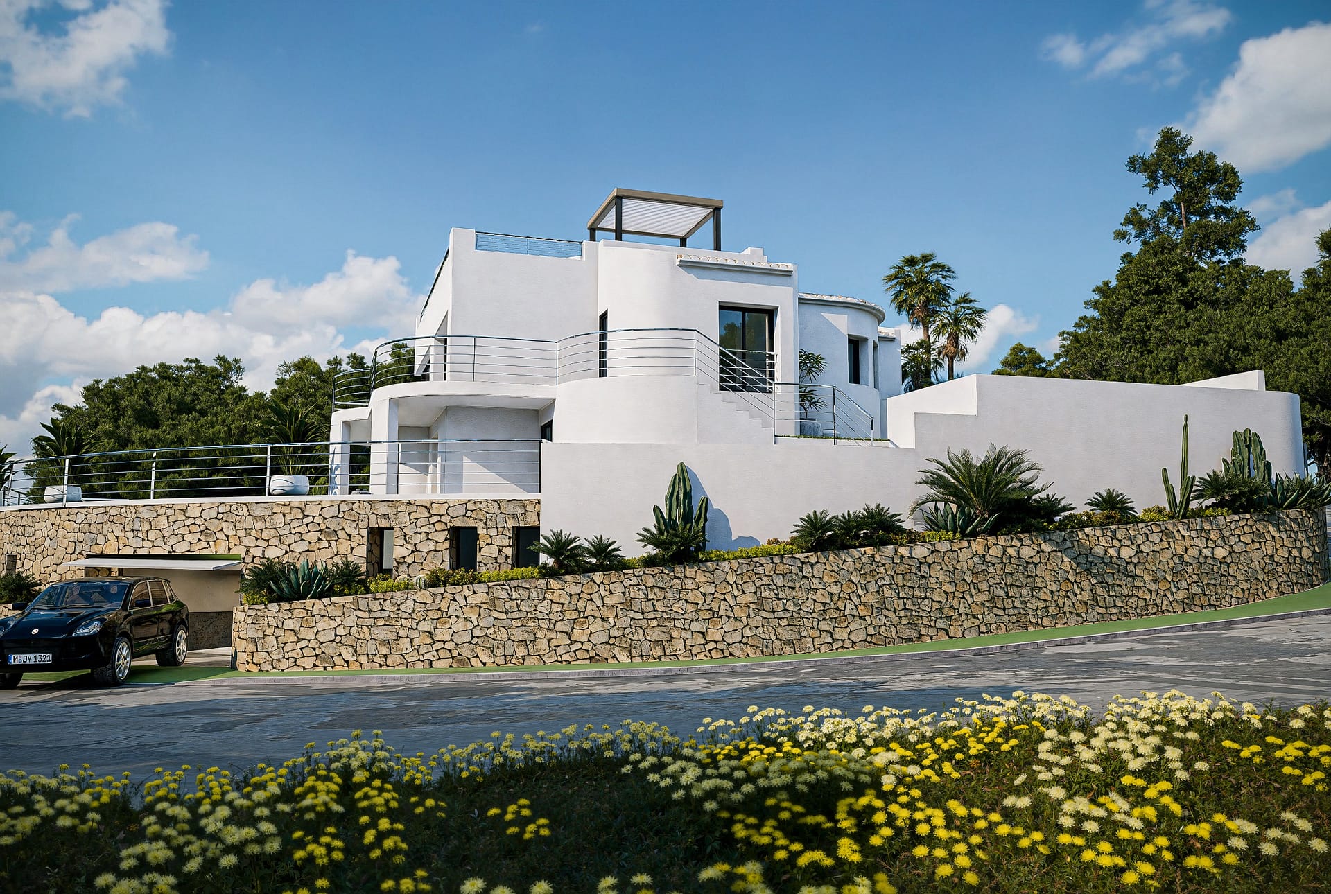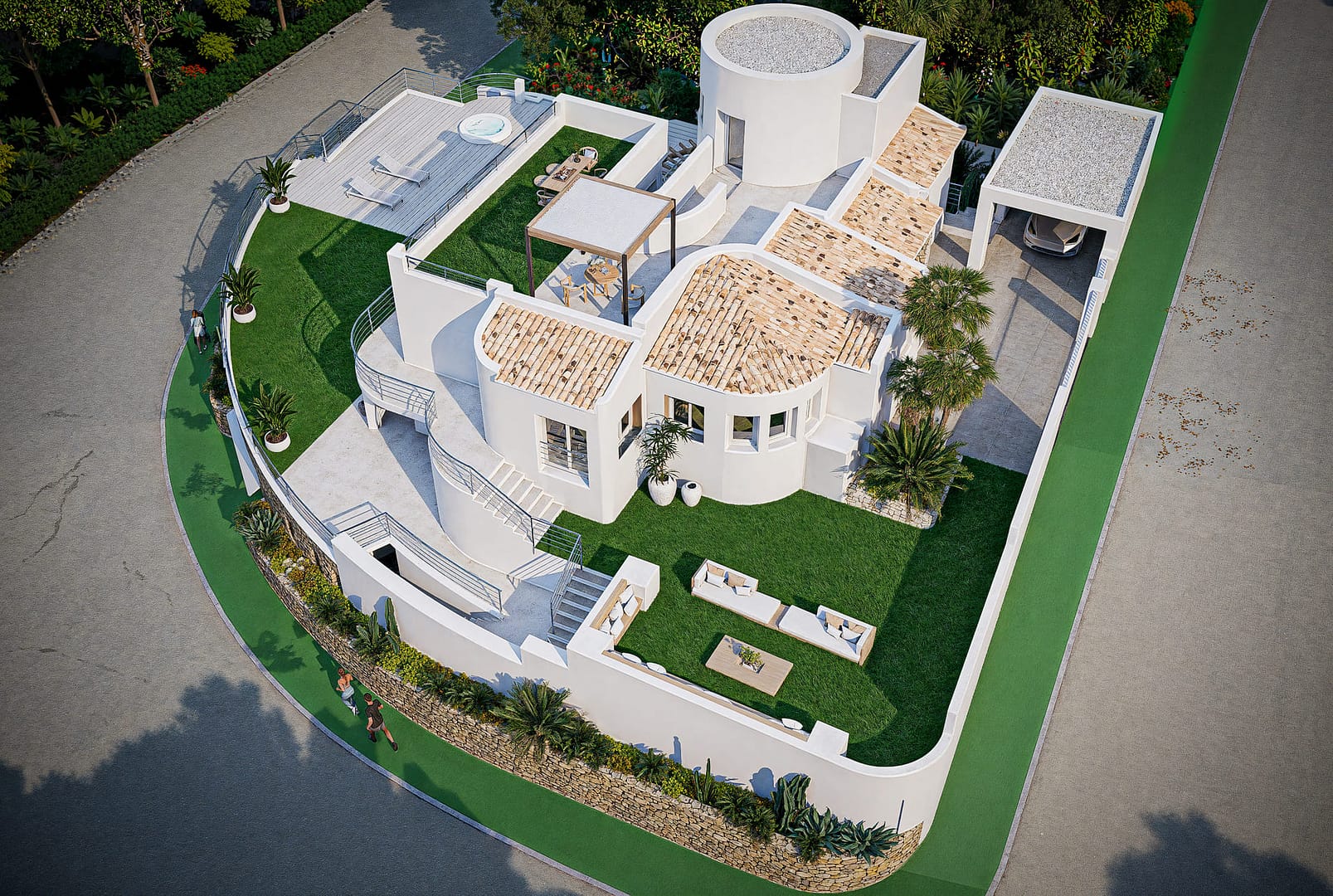 The exterior of the villa is designed to maximize enjoyment of the Mediterranean climate. It features a private garden offering a green space to relax or for children to play outdoors. The terrace is perfect for outdoor dining or simply relaxing while watching the sea. Additionally, the villa has a solarium, an ideal space for sunbathing in total privacy. The presence of a pergola adds a touch of elegance and provides shade on the sunniest days. The jewel of the exterior is the private pool, offering a refreshing place to swim and relax during the warm summer days.